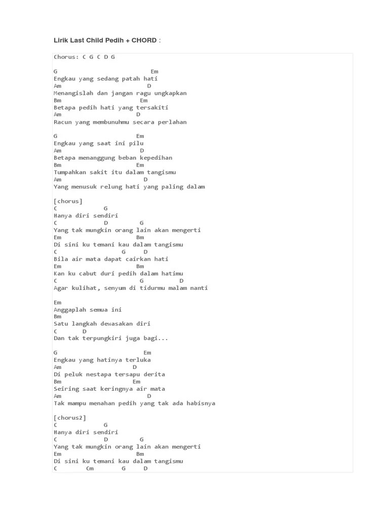 E b c#m a e d# c#m b malam ini hujan turun lagi a g#m f#m b. Ab a a# bb b c c# db d d# eb e f f# gb g g#. Betapa pedih hati yang tersakiti. Betapa pedih hati yang tersakiti. engkau yang sedang patah hati. engkau yang sedang patah hati. Chord gitar last child pedih. Betapa pedih hati yang tersakiti. Menangislah dan jangan ragu ungkapkan. Betapa pedih hati yang tersakiti. engkau yang sedang patah hati by: F g tentang perasaanmu am yang engkau simpan untuknya. engkau yang sedang patah hati.