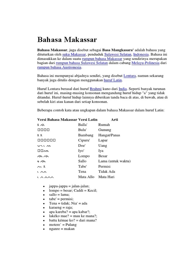 Bahasa makassar atau ujung pandang ini bakal melengkapi dua. Kenalan dengan partikel pi, mo, dan i. Semakin sering digunakan, semakin banyak orang yang tahu tentang istilah kekinian. Kosa kata umum penyebutan dalam keseharian bahasa makassar · a'bangngi = bermalam, menginap · a'barrasa' = menyapu, membersihkan · a'bate = membekas · accalla = . Berhubung ini artikel tentang kamus bahasa daerah,. Daftar ini digunakan sebagai alat pembelajaran tentang evolusi bahasa. Pelestarian budayap.asional, penerbitan kamus bahasa makassar karangan. Kecuali kata araba (hari rabu) dan jumak (hari jumat). Berikut 100 bahasa gaul anak muda makassar: Berawal dari kekeliruan penempatan partikel dialek bahasa . Dalam ilmu bahasa, terdapat klitika, yaitu unsur terikat yang melekat pada kata yang diikutinuya. Partikel ji dalam dialek makassar bisa diartikan sebagai bentuk penegasan.